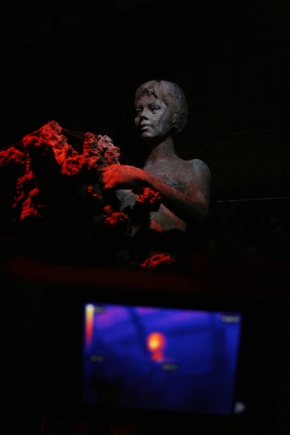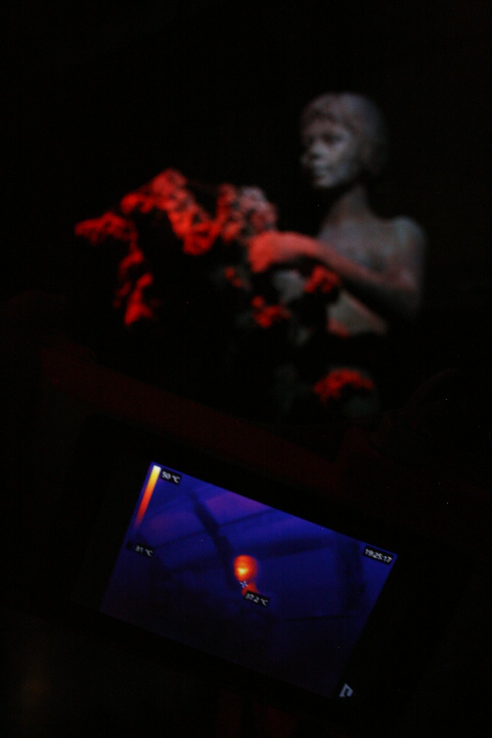 In the installation, visitor could observe the sculpture through the thermocamera and discover what is in her head - fragments of melodies of marches and communist songs.